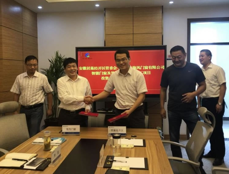 2018年9月18日安徽居巢經(jīng)開(kāi)區(qū)管委會(huì)與巢湖市海風(fēng)門(mén)窗有限公司智能門(mén)窗及等離子玻璃深加工項(xiàng)目,投資合作協(xié)議簽約儀式